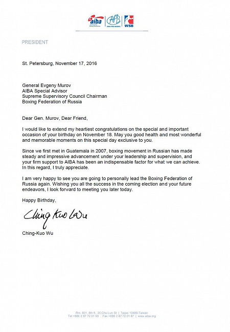 ГЛАВА AIBA ЧИНГ-КОУ ВУ ПОЗДРАВИЛ ЕВГЕНИЯ МУРОВА С ДНЕМ РОЖДЕНИЯ