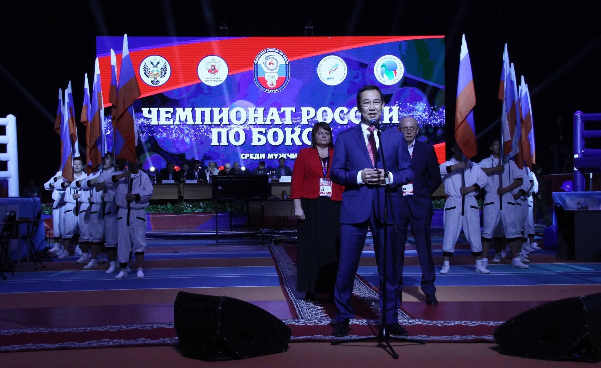 В церемонии открытия чемпионата приняли участие Глава Республики Саха (Якутия) Айсен Николаев, руководитель администрации Федерации бокса России, вице-президент Европейской конфедерации бокса (EUBC) Татьяна Кириенко и председатель Всероссийской судейской коллегии Федерации бокса России, технический делегат чемпионата России Валерий Рачков.