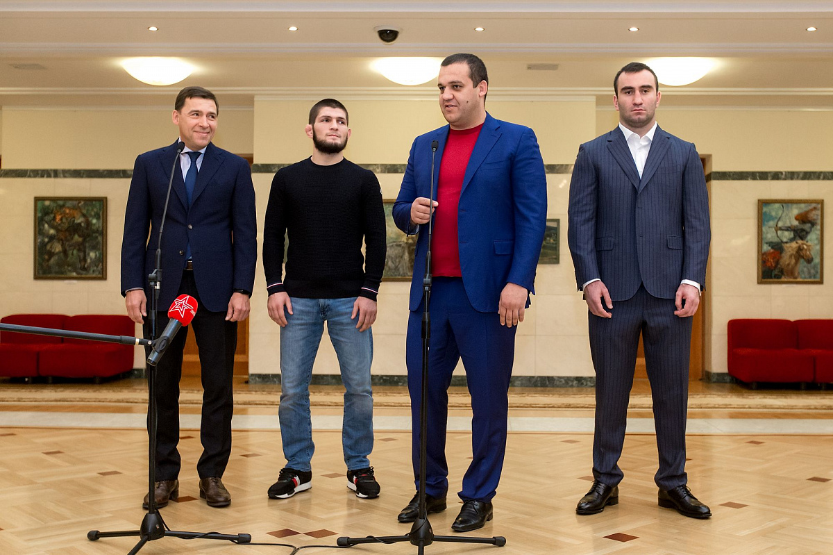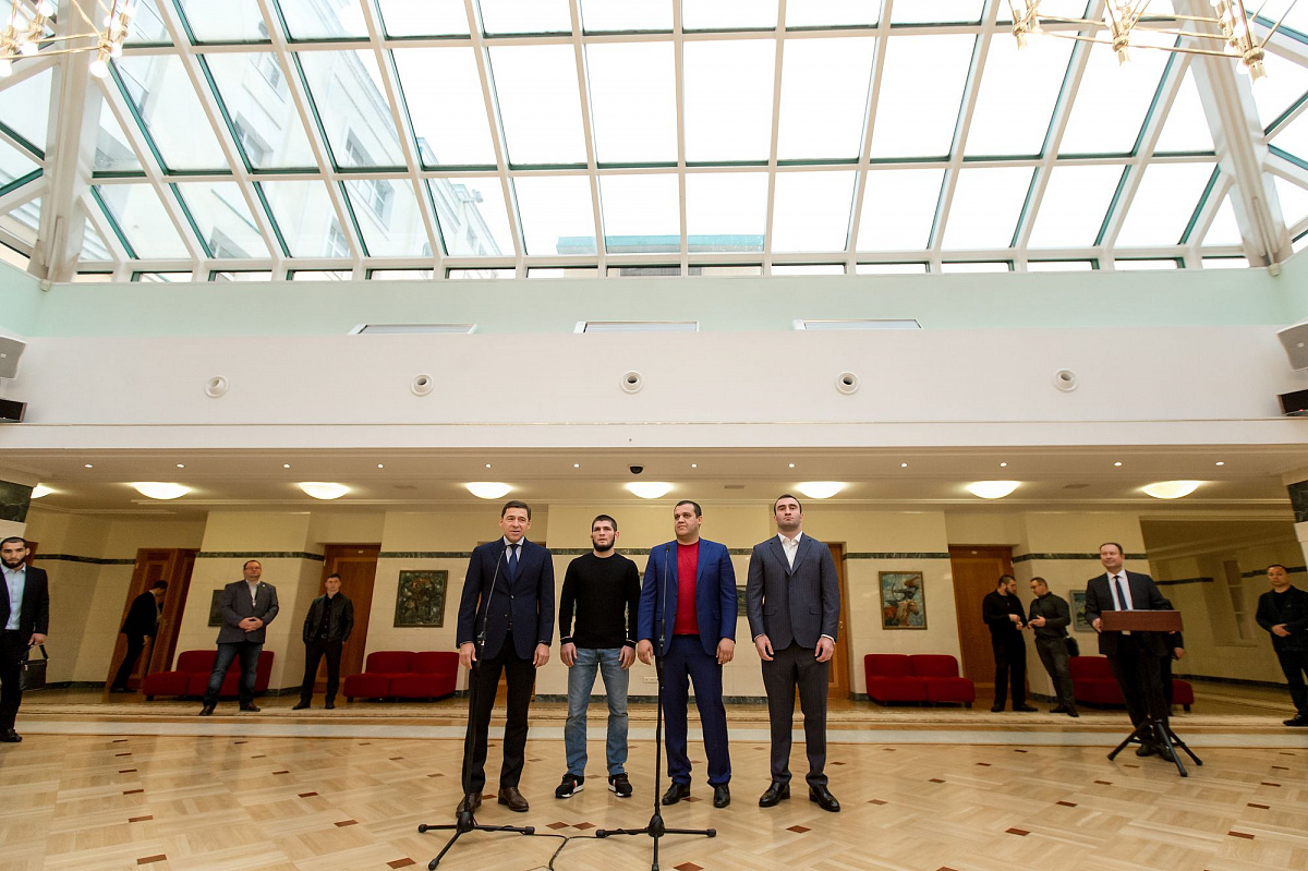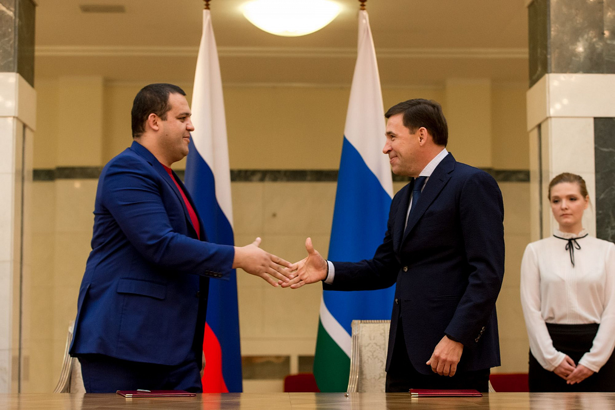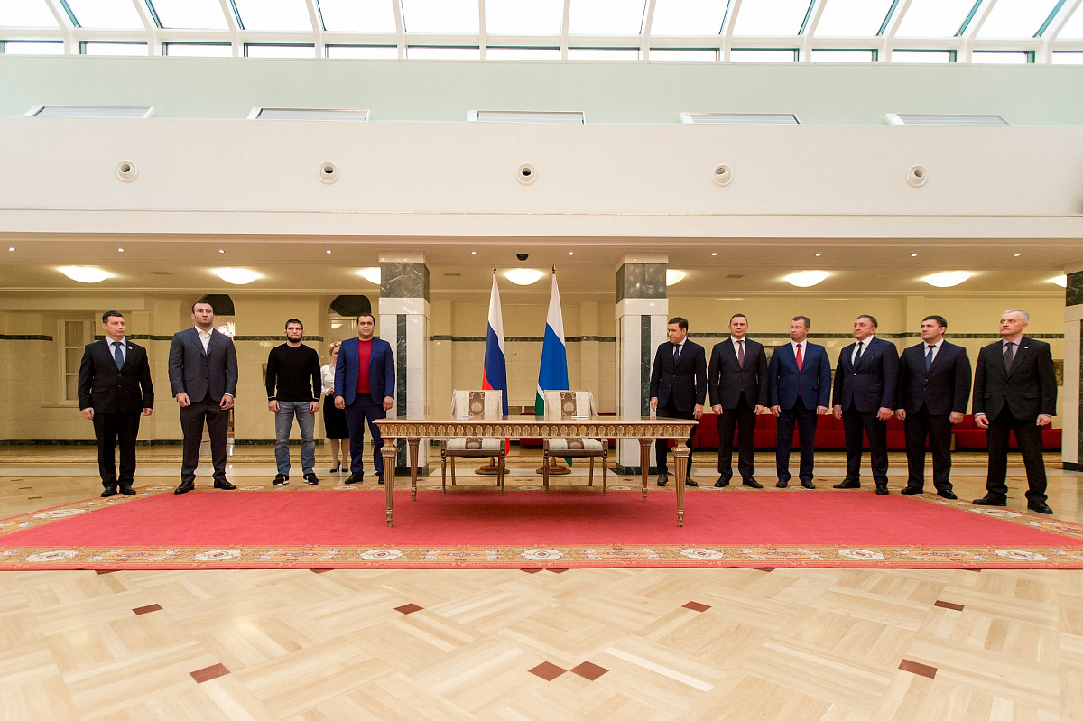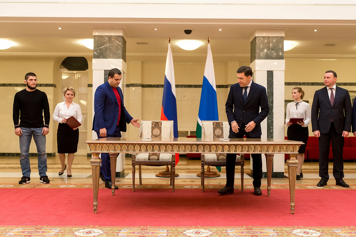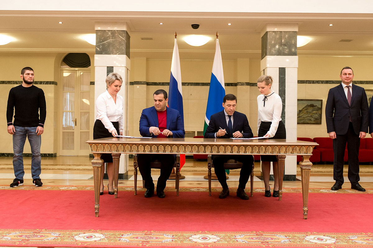 Церемония подписания состоялась в резиденции губернатора в Екатеринбурге, на ней присутствовали российский боксер-профессионал Мурат Гассиев и чемпион по смешанным единоборствам Хабиб Нурмагомедов.
