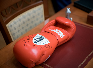 Умар Назарович преподнёс Главе республики в качестве памятного подарка пару боксерских перчаток с автографами олимпийских чемпионов и чемпионов мира по боксу - Александра Поветкина, Шамиля Сабирова, Александра Малетина и Альберта Селимова.