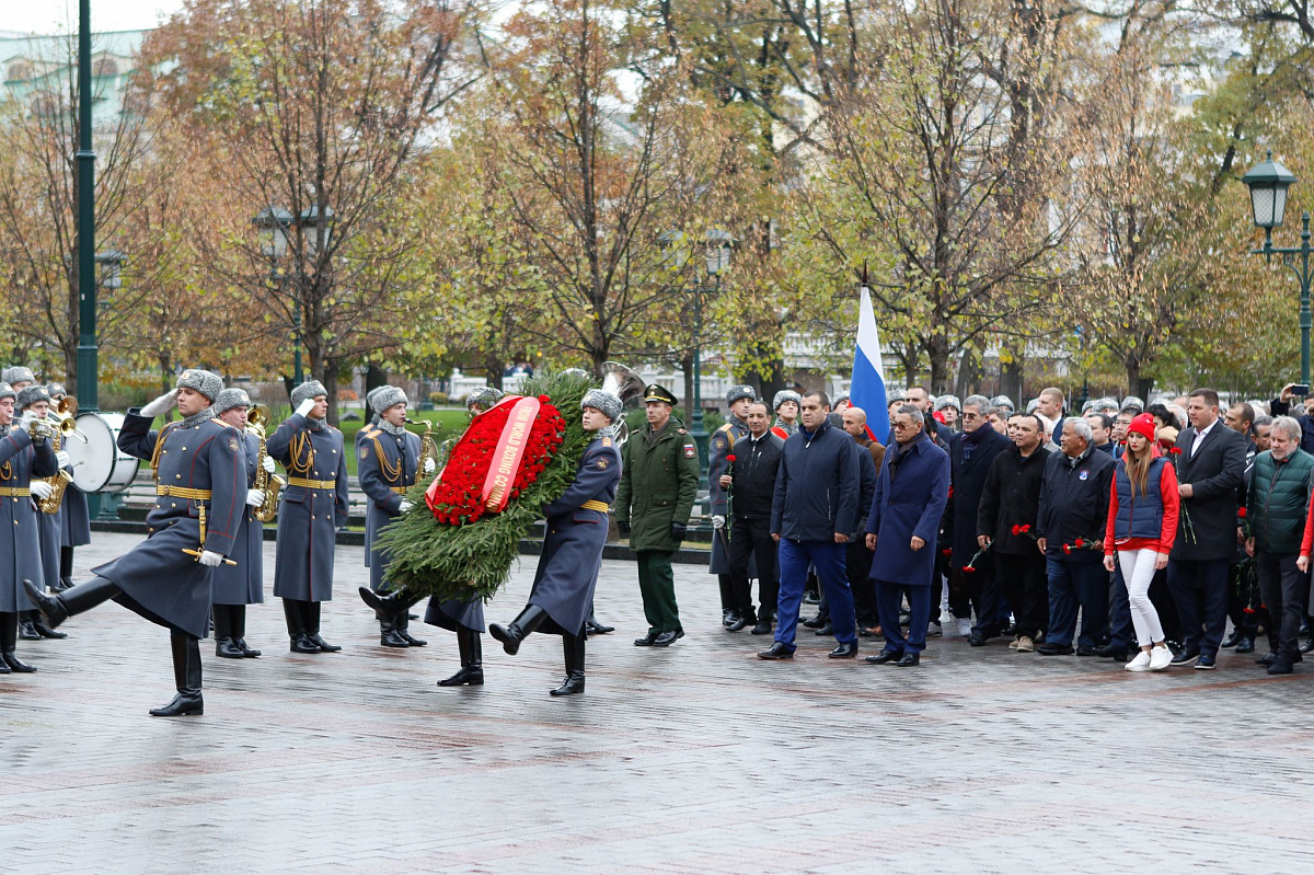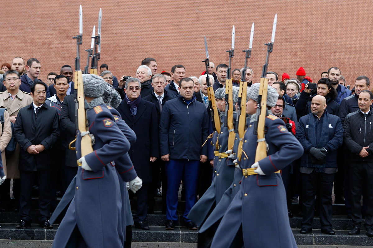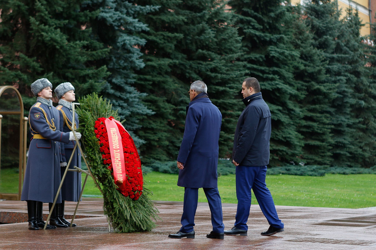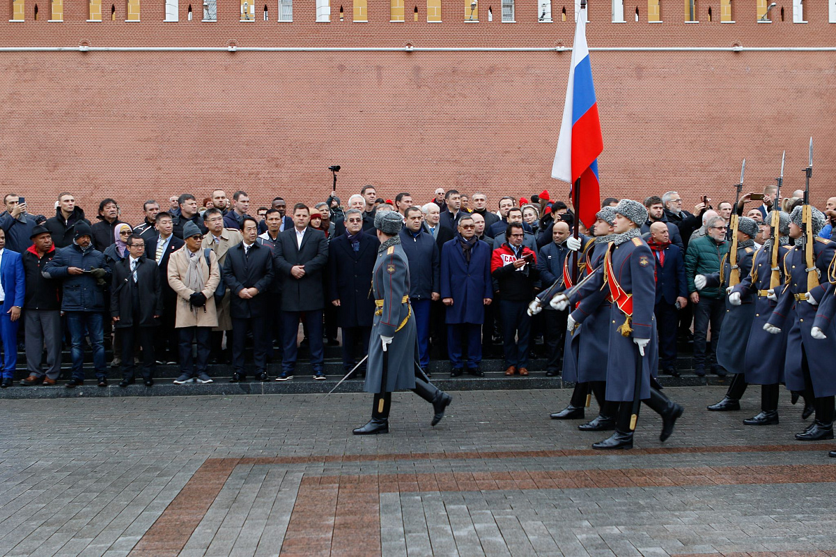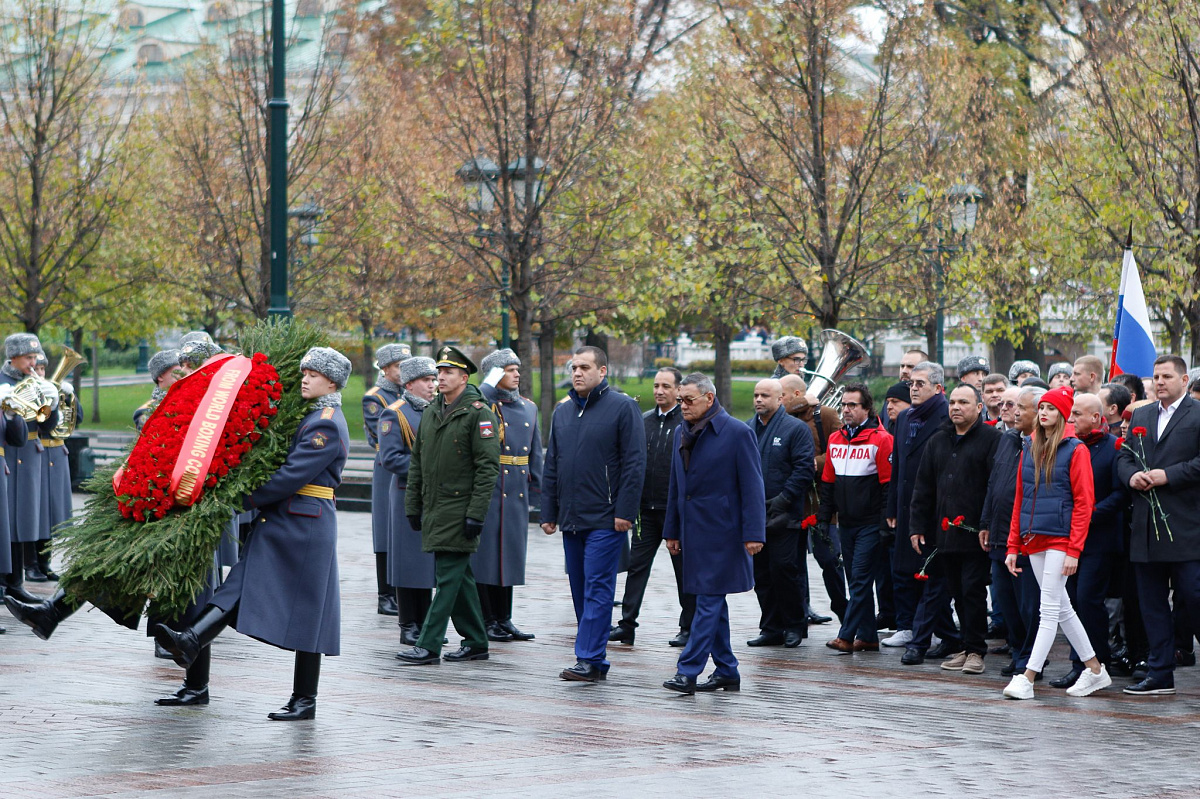 Временный президент Международной ассоциации бокса (AIBA) Гафур Рахимов и генеральный секретарь Федерации бокса России Умар Кремлёв в сопровождении участников конгресса AIBA возложили цветы к Могиле Неизвестного солдата в память о погибших в Великой Отечественной войне.