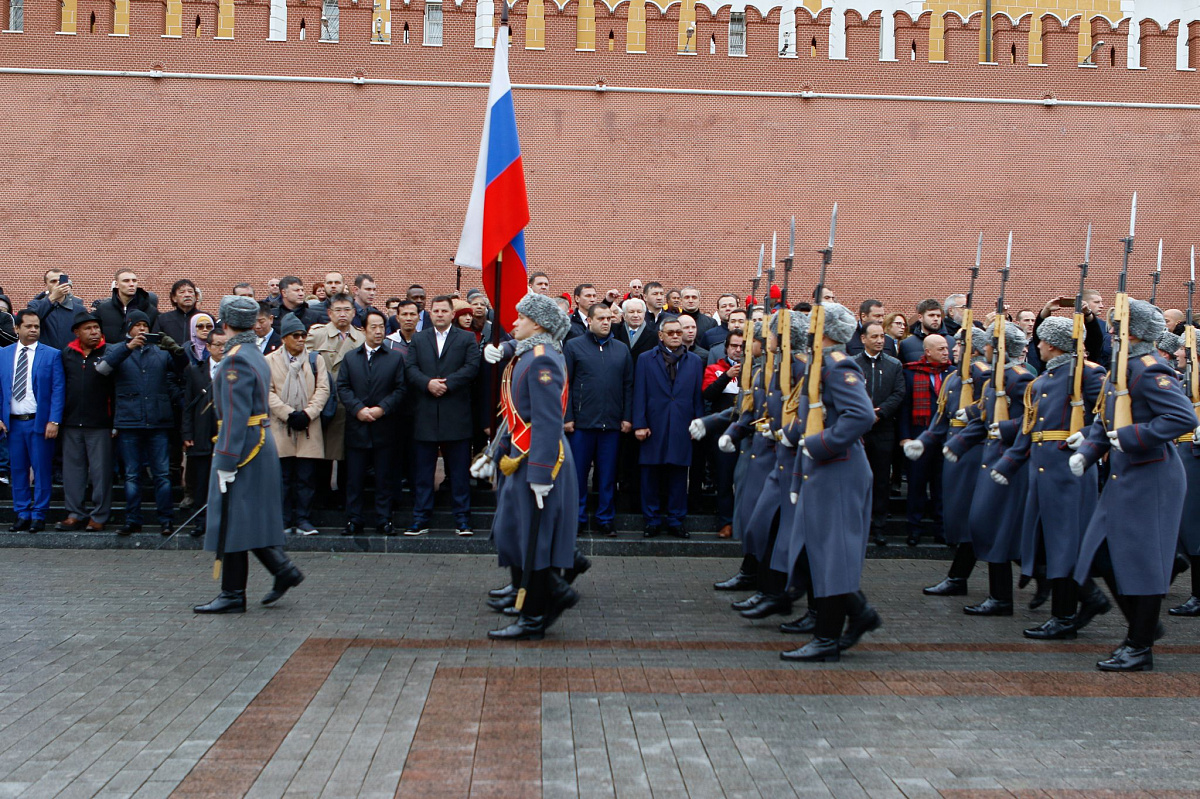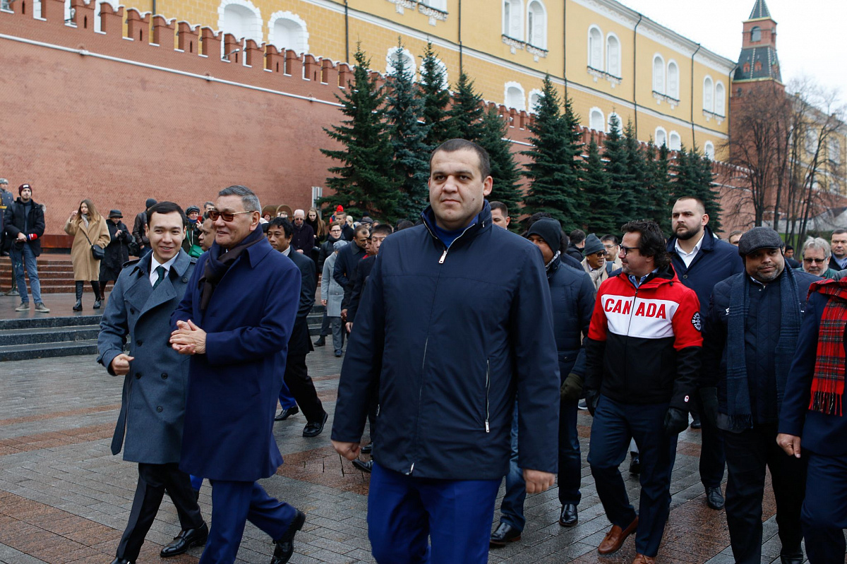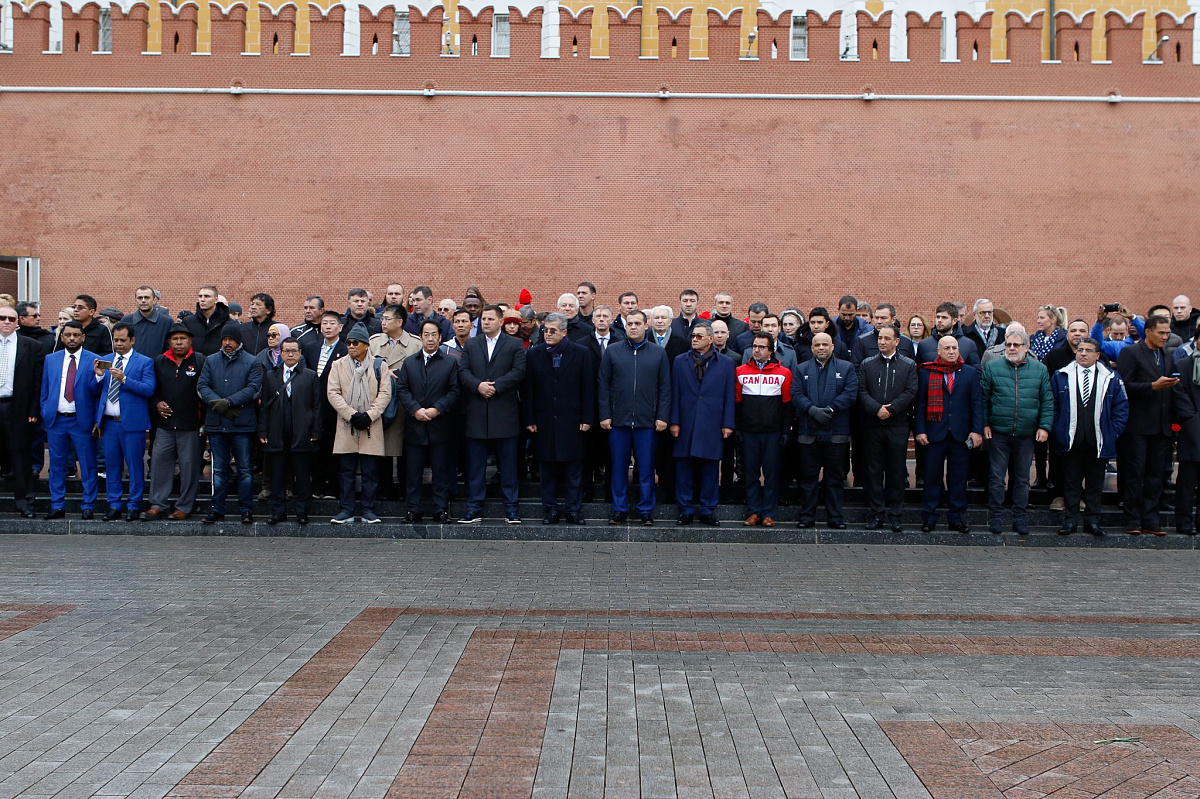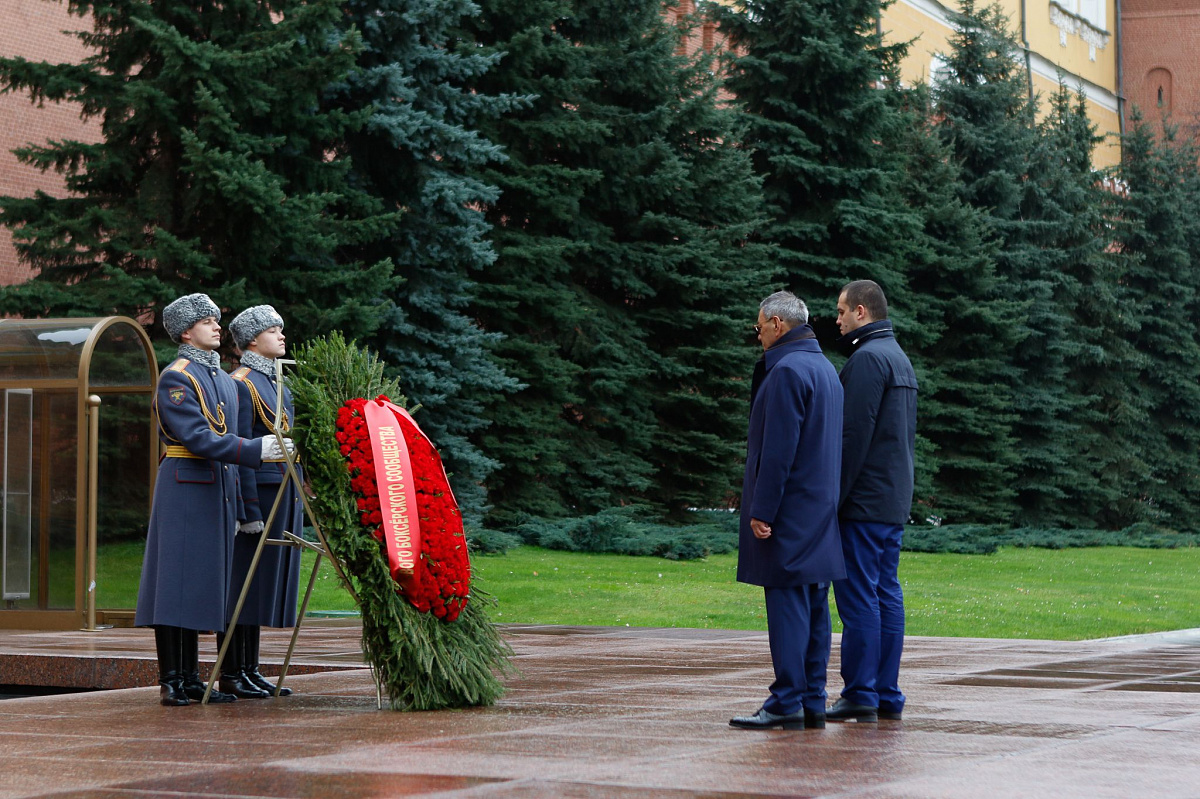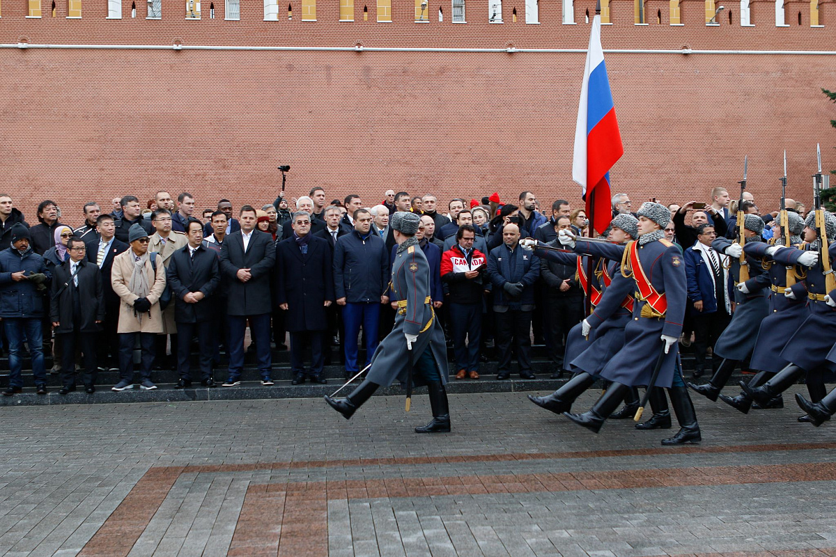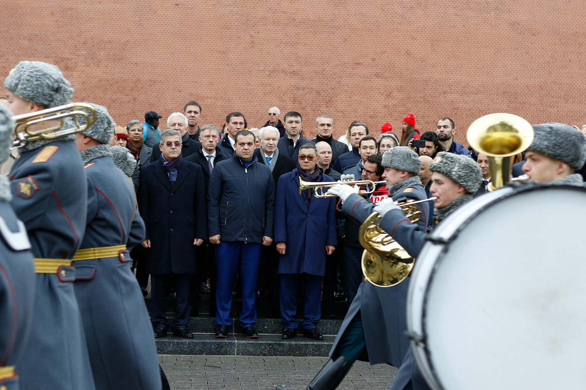 Временный президент Международной ассоциации бокса (AIBA) Гафур Рахимов и генеральный секретарь Федерации бокса России Умар Кремлёв в сопровождении участников конгресса AIBA возложили цветы к Могиле Неизвестного солдата в память о погибших в Великой Отечественной войне.