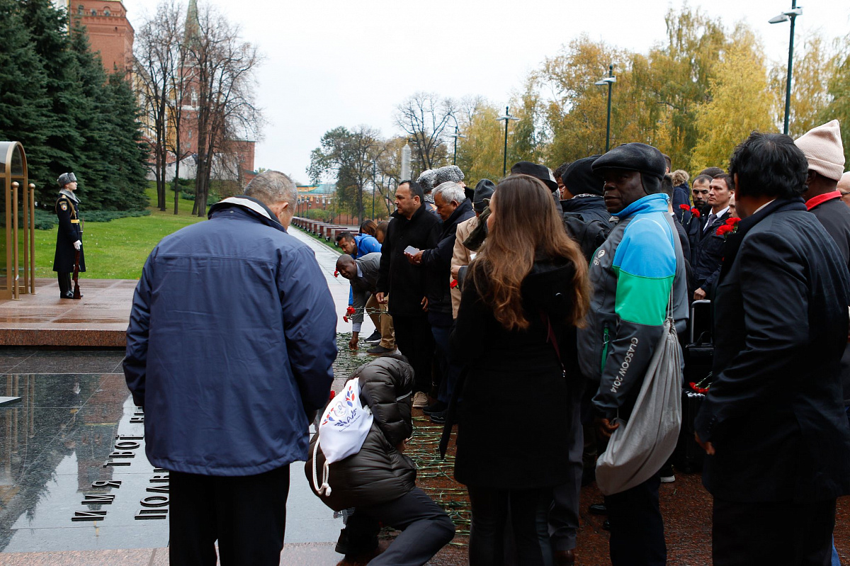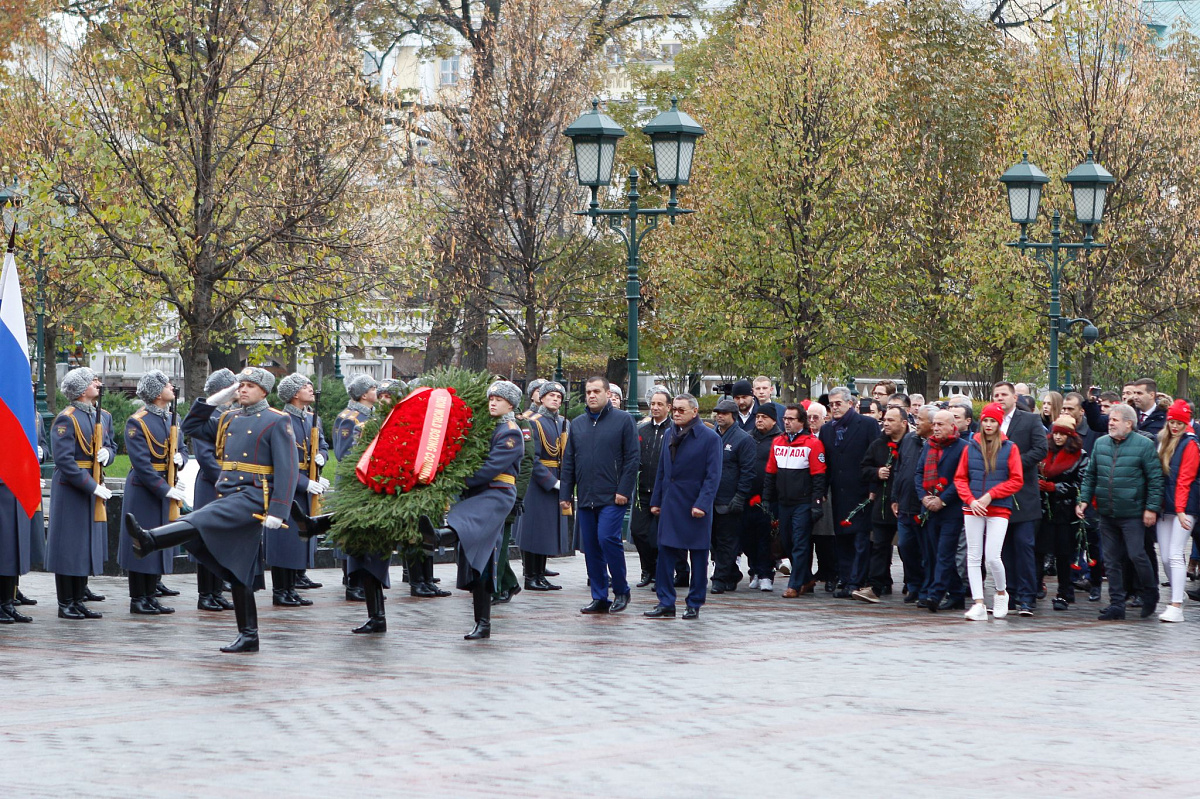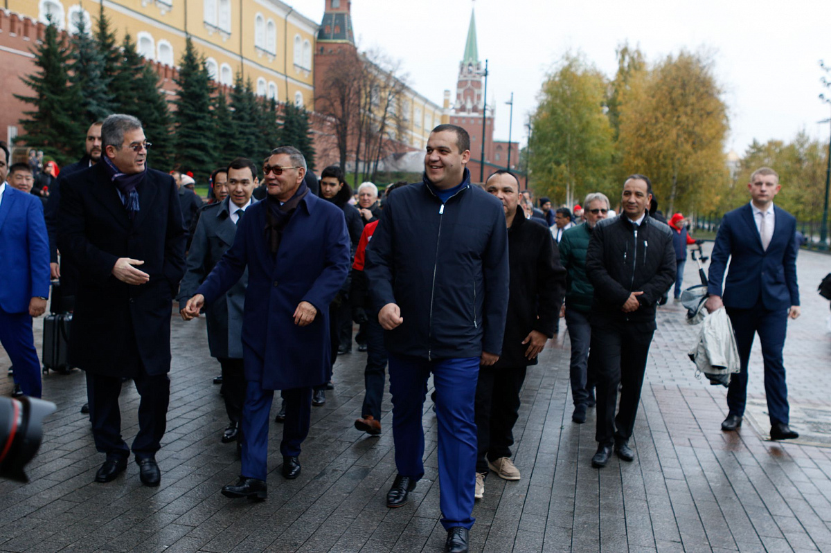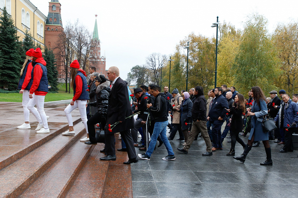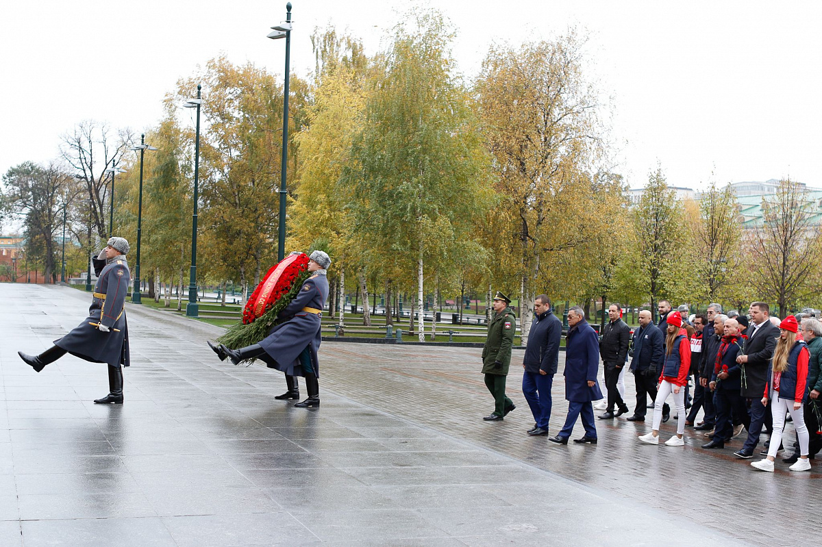 Временный президент Международной ассоциации бокса (AIBA) Гафур Рахимов и генеральный секретарь Федерации бокса России Умар Кремлёв в сопровождении участников конгресса AIBA возложили цветы к Могиле Неизвестного солдата в память о погибших в Великой Отечественной войне.