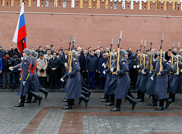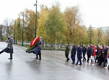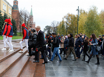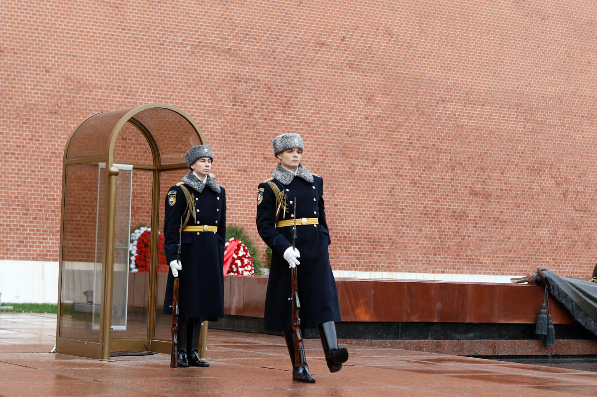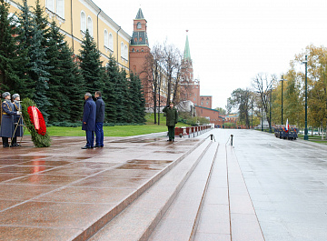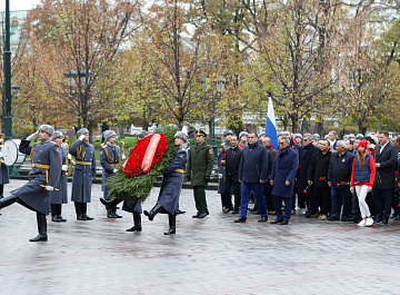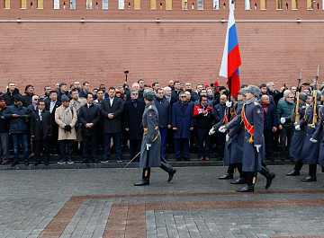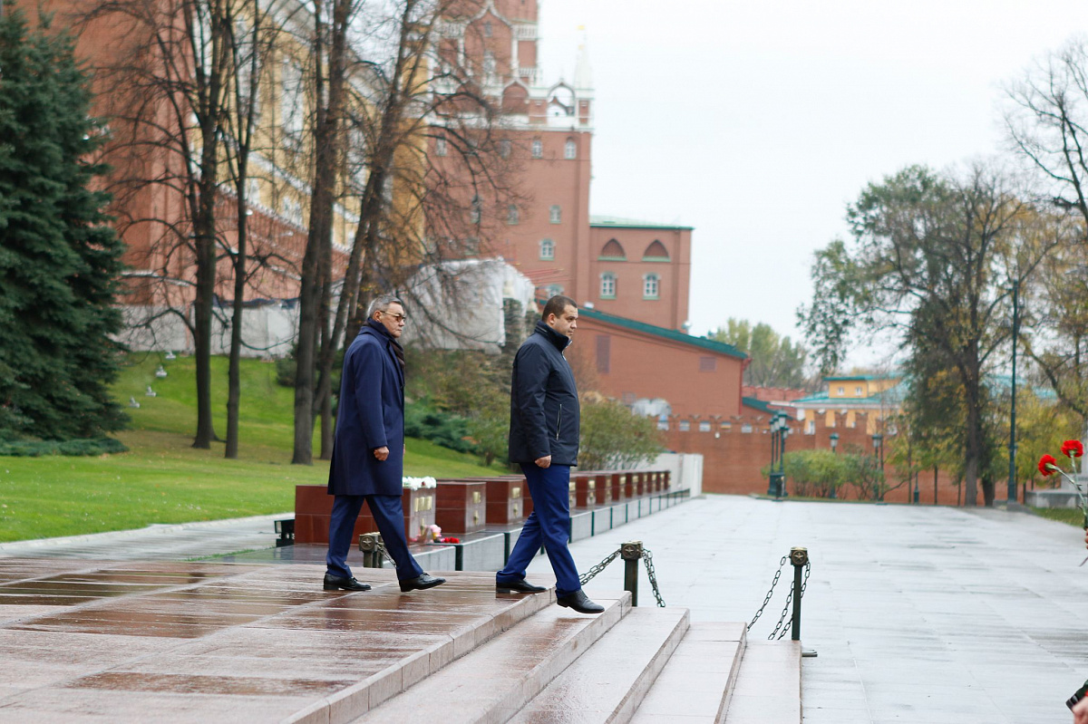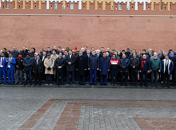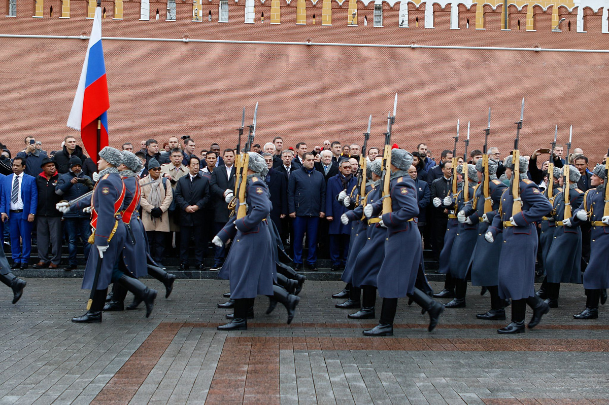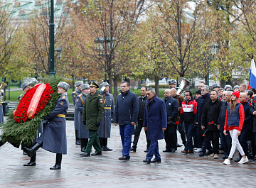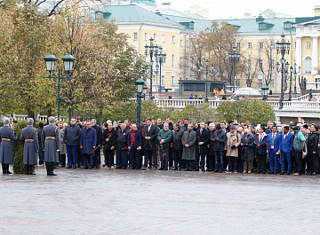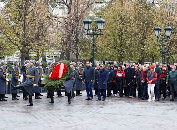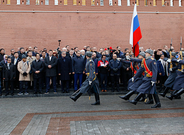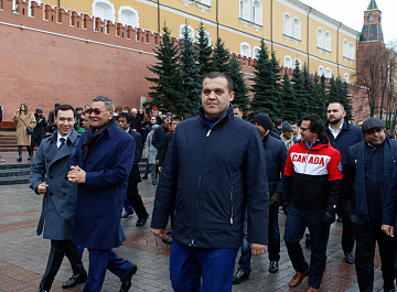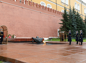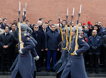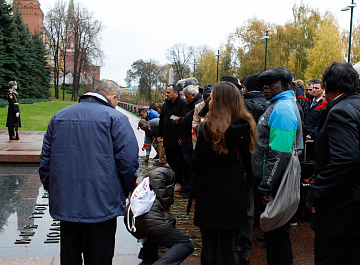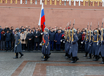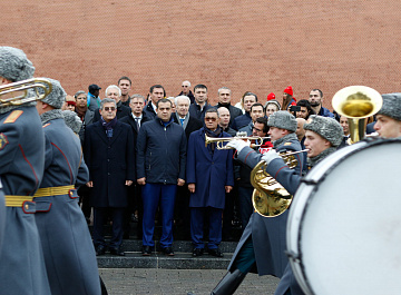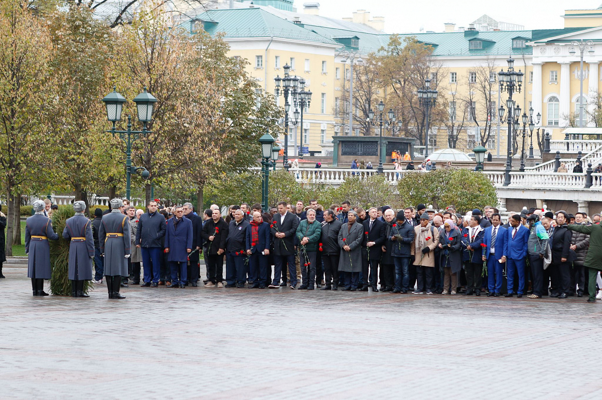Временный президент Международной ассоциации бокса (AIBA) Гафур Рахимов и генеральный секретарь Федерации бокса России Умар Кремлёв в сопровождении участников конгресса AIBA возложили цветы к Могиле Неизвестного солдата в память о погибших в Великой Отечественной войне.